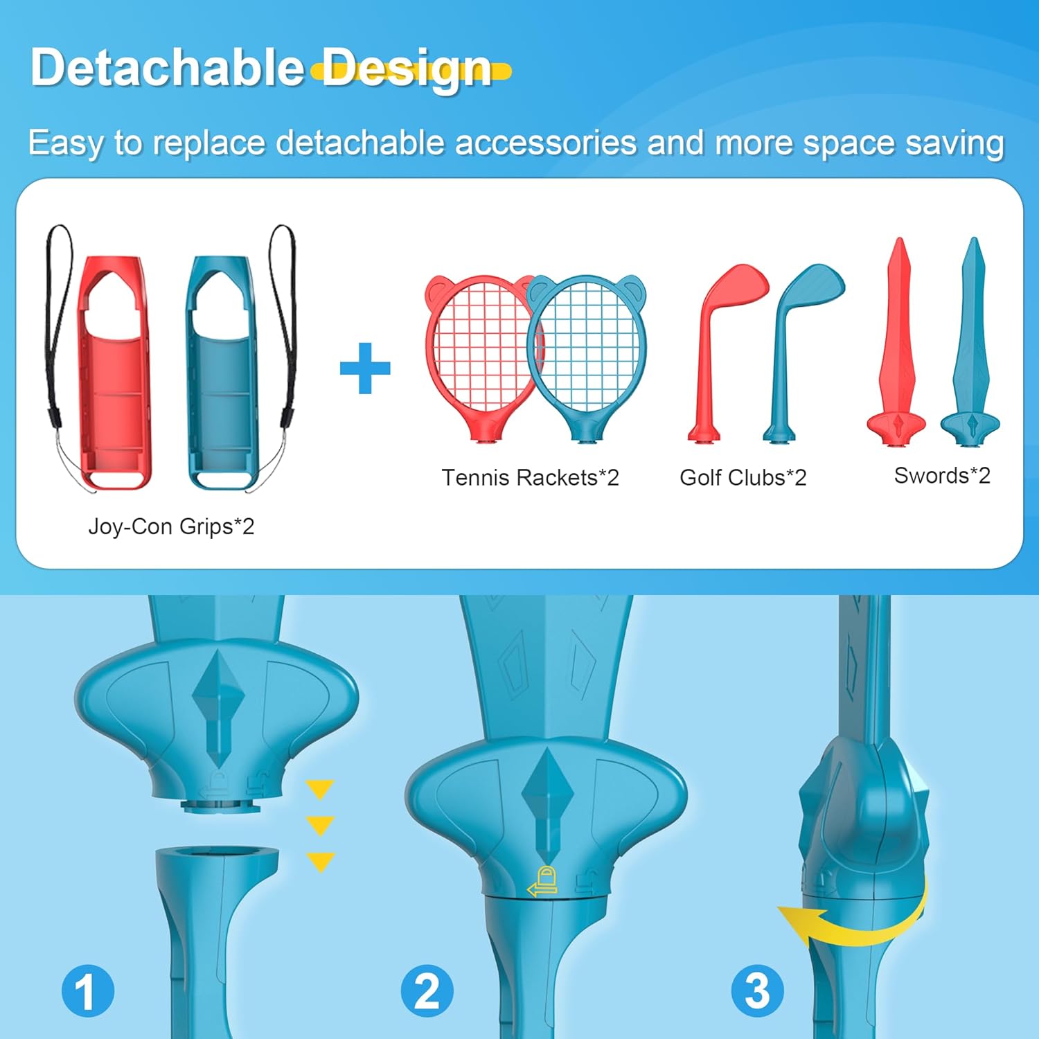 - Detachable Design: Tennis Rackets, Golf Clubs, Swords feature a detachable design, very convenient for you to easily assemble and disassemble according to your Switch gaming needs, and also help you save space. The included instruction manual provides easy installation guide. Comes with a hand strap to prevent accidental throwing while playing games.