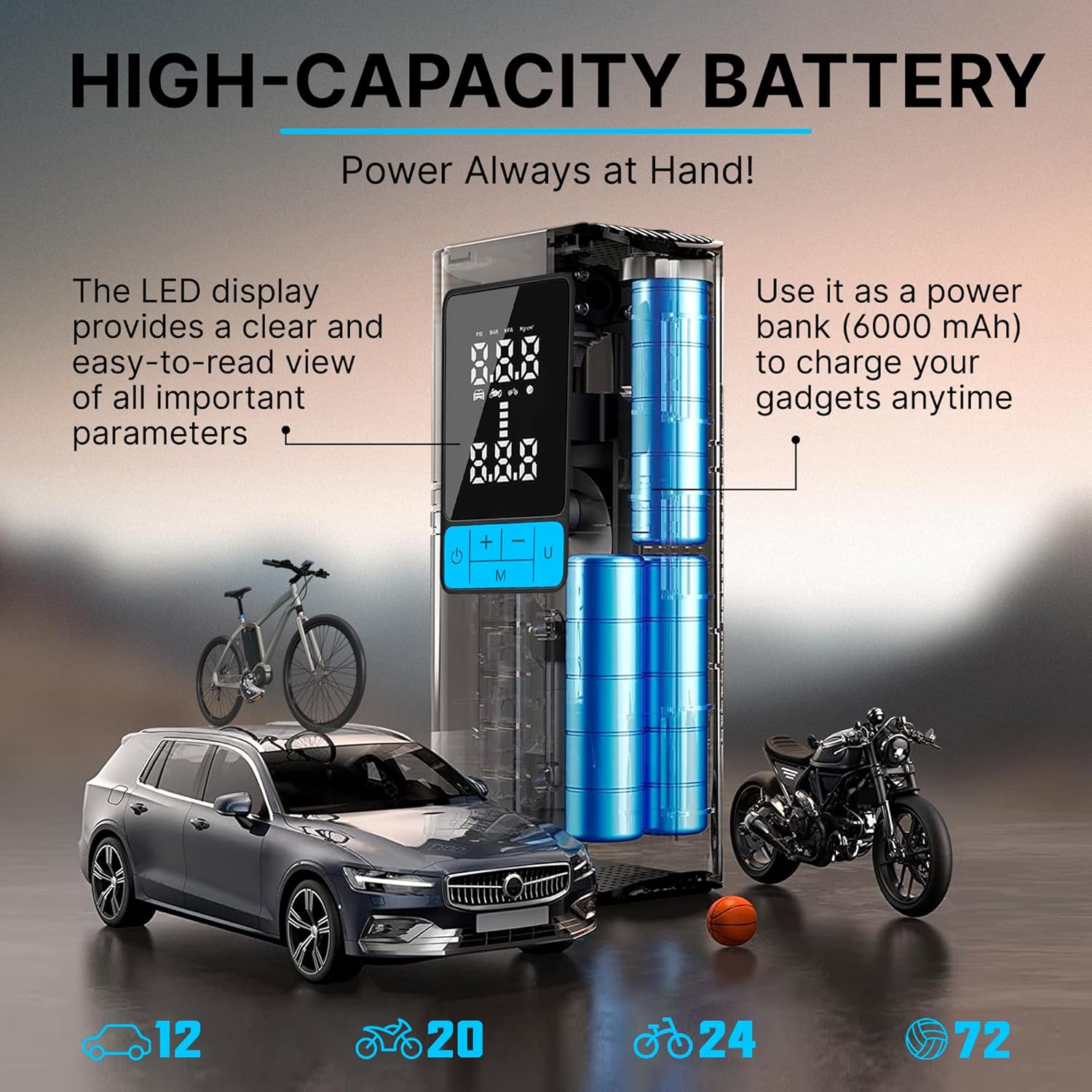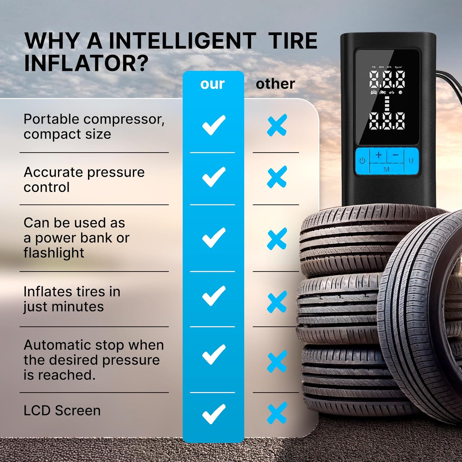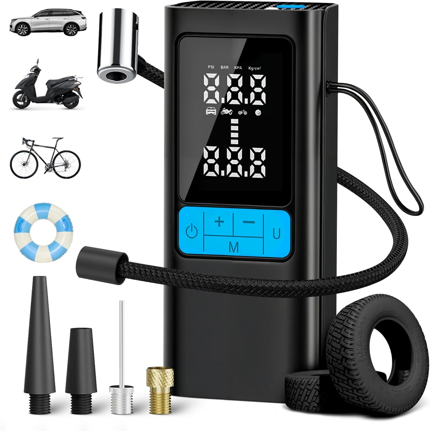 - 4X Faster Inflation with Precision Auto-Stop Technology Experience rapid tire inflation that’s 4X quicker than standard pumps, thanks to a high-performance motor and optimized airflow design. The advanced digital display ensures ±0.1 PSI accuracy, allowing you to preset pressure for cars (2.2–2.8 bar), motorcycles (1.8–3.0 bar), bicycles (30–65 PSI), or sports equipment like balls (4–16 PSI). The compressor automatically shuts off when reaching your desired pressure, eliminating overinflation risks. Perfect for busy drivers, cyclists, and families needing quick, reliable results.