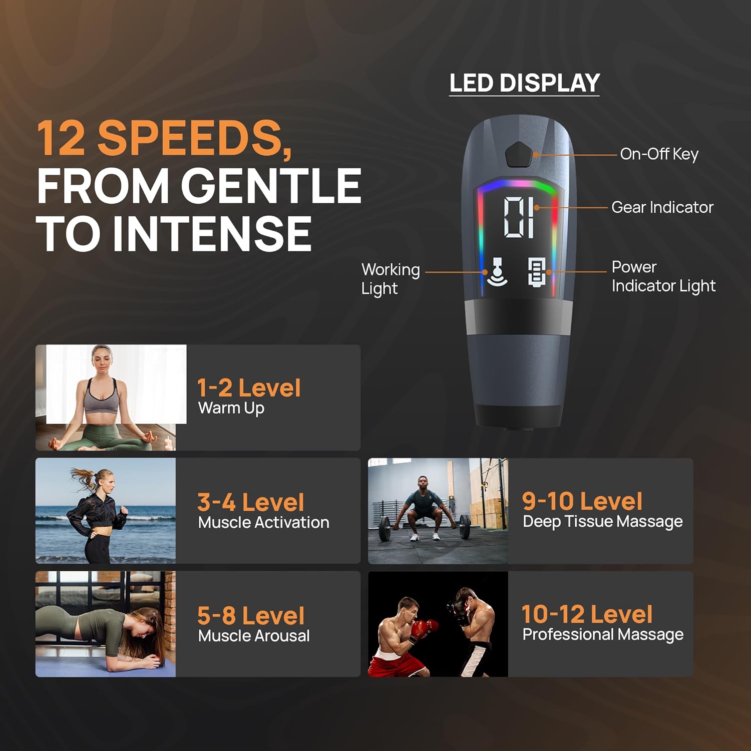 - 12 Speed Levels with LCD Precision Control: This Electric Muscle Relaxation with 12 adjustable speed settings ranging from (2200 RPM) to deep tissue therapy (3500 RPM). The LCD screen displays battery life, speed, and timer for effortless adjustments.