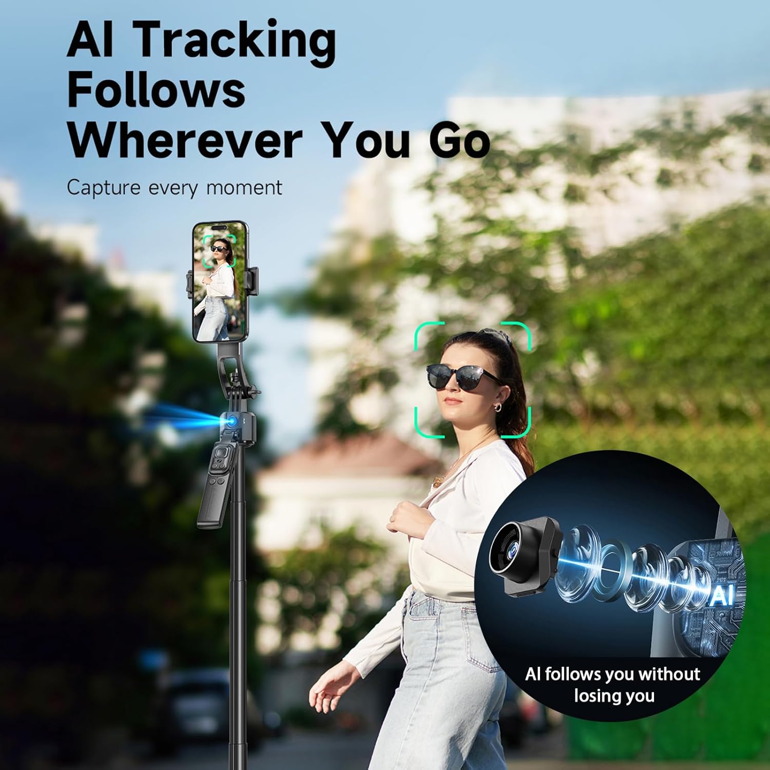 - AI Face Tracking & Gesture Control: Built in AI camera, the selfie stick tripod supports smart face tracking, following wherever you go and capturing every moment. It also offers gesture control functionality. Simply make the OK gesture to start tracking, and palm gesture to pause the tracking, providing a hands-free experience.