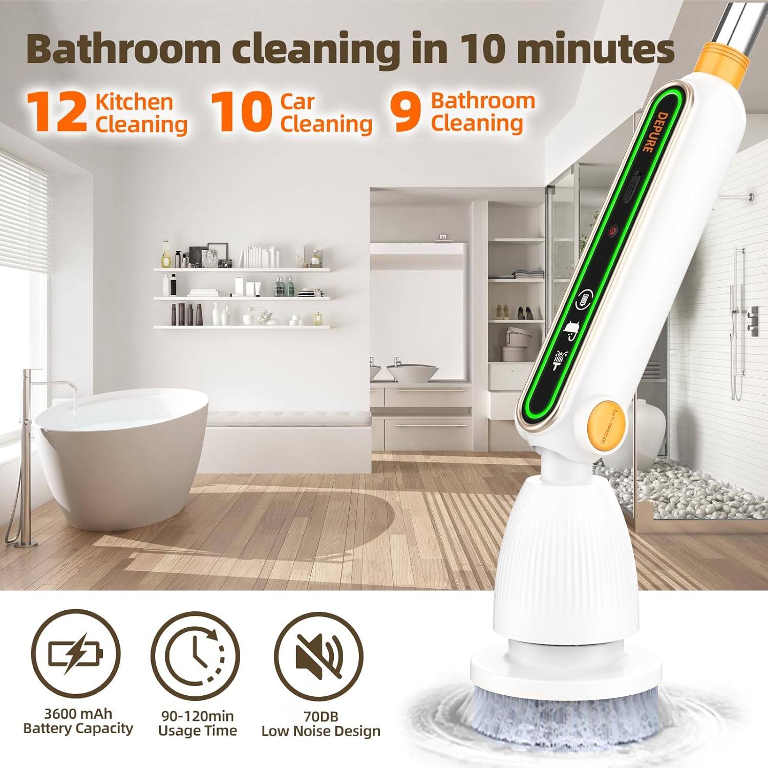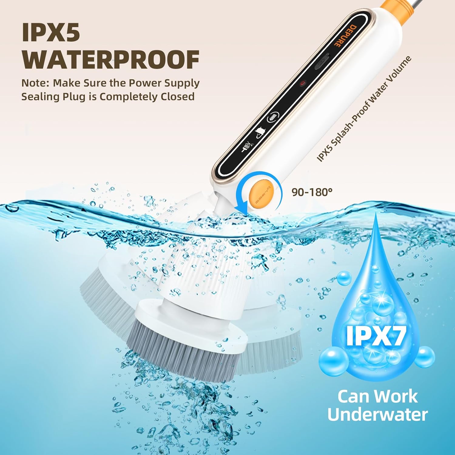 - 【Adjustable Brush Head Angle, Telescopic Pole & IPX7 Waterproof】The electric spin scrubber provides 4 adjustable angles to effectively reach every corner. The telescopic pole is ideal for users with arthritis or back pain, while the IPX7 waterproof brush head ensures reliable performance. Please note that the area outside the brush head only has an IPX5 waterproof rating.