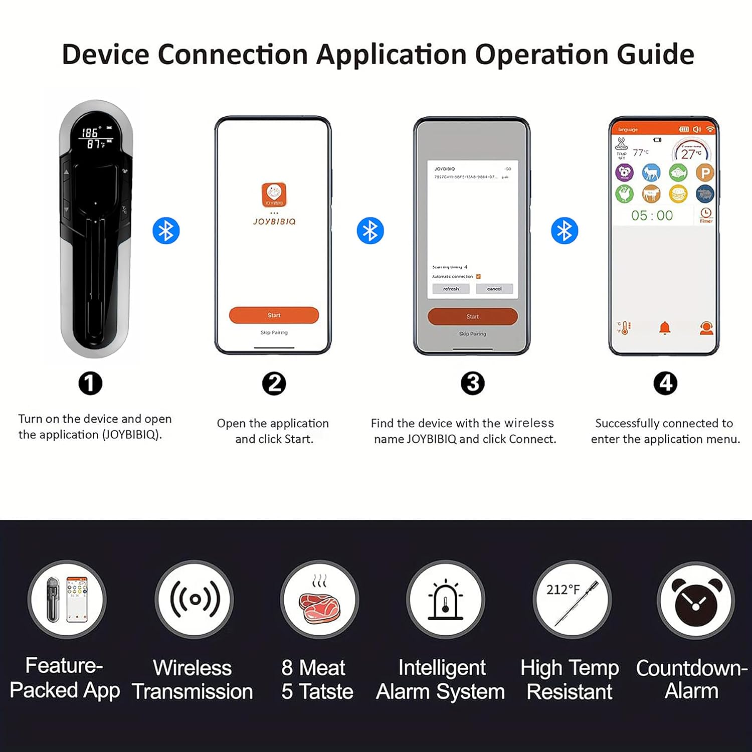 - 【Bluetooth Smart Reminder】: Our wireless meat probe supports Bluetooth and is equipped with a smart app, eliminating the problem of wire entanglement, providing multiple cooking solutions and dual alarms. Let your cooking journey no longer be full of uncertainty. Monitor the cooking situation on your mobile phone and you will receive a reminder when the food is ready.