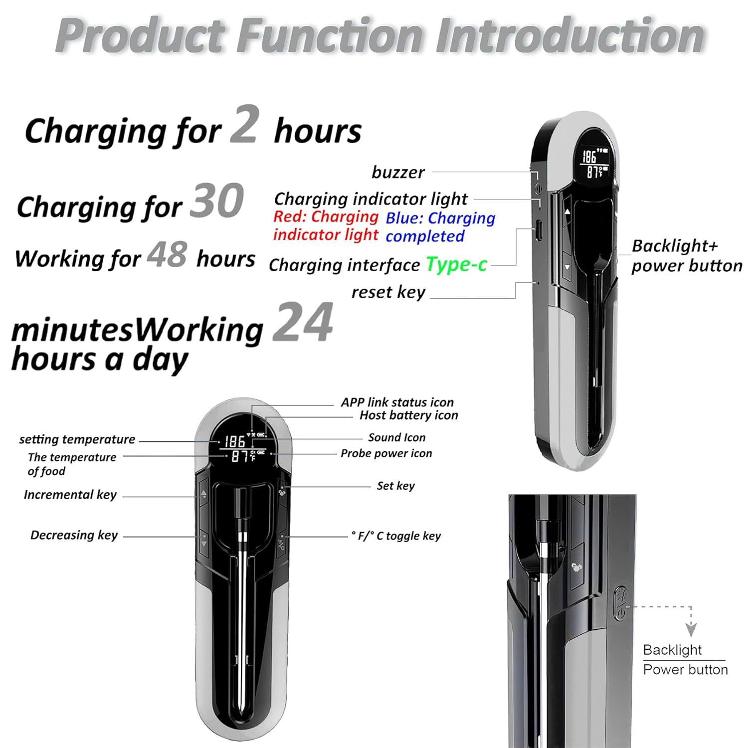 - 【Rechargeable and Waterproof】: This wireless thermometer for grilling has an excellent waterproof design and is rechargeable. After use, it is safe to rinse it directly with water or put it in the dishwasher. But please note, please do not wash the probe in water immediately after use to avoid damaging the probe. The rechargeable design is also very suitable for long-term cooking, such as smoking and grilling. It ensures the grasp of its flavor.