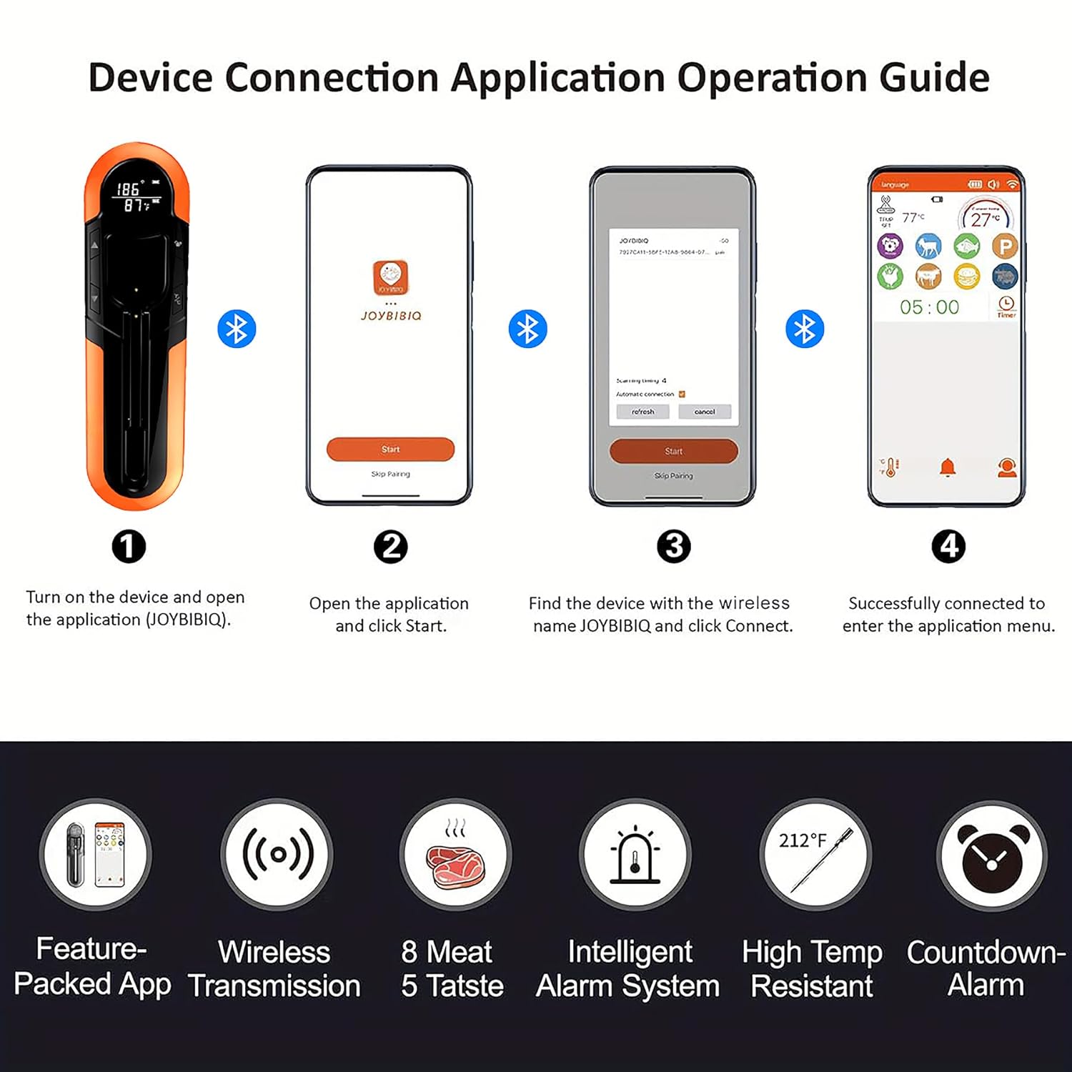 - 【Bluetooth Smart Reminder】: Our wireless meat probe supports Bluetooth and is equipped with a smart app, eliminating the problem of wire entanglement, providing multiple cooking solutions and dual alarms. Let your cooking journey no longer be full of uncertainty. Monitor the cooking situation on your mobile phone and you will receive a reminder when the food is ready.