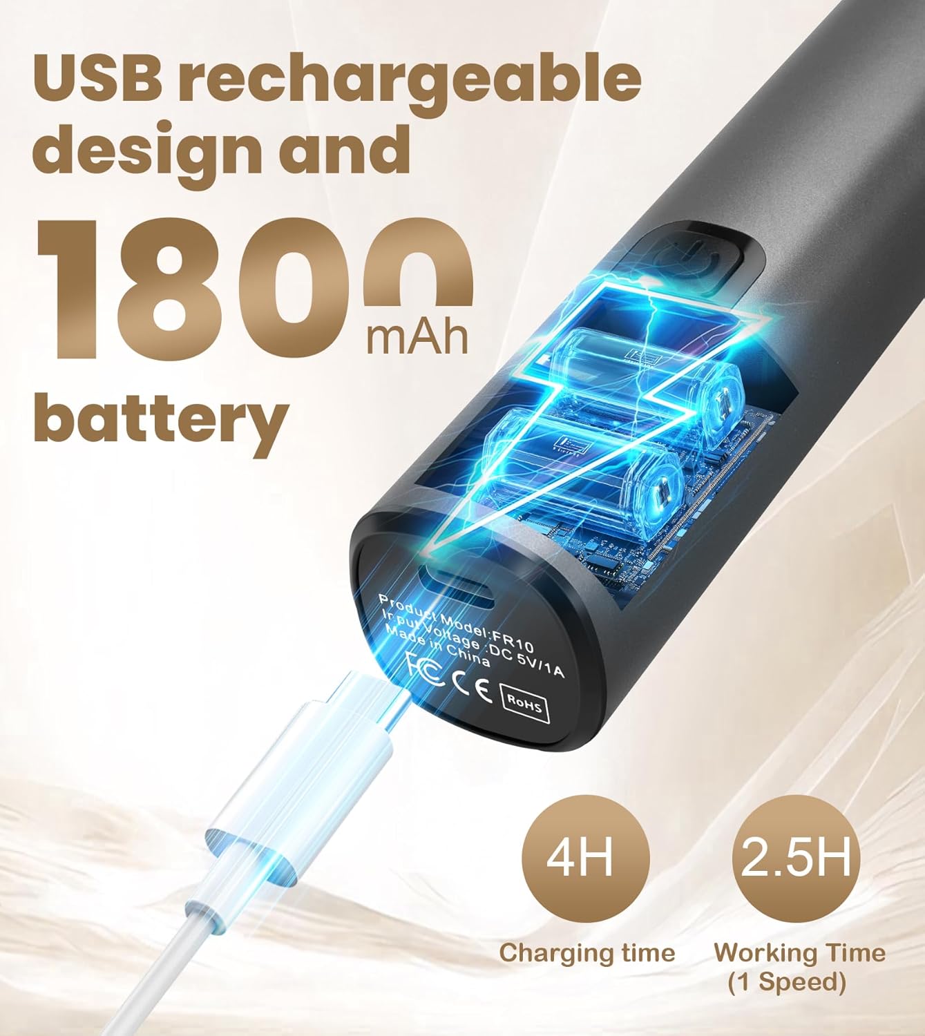 - USB-Rechargeable & High Capacity Battery:Built-in 1800mAh battery, after a full charge, at last 150+ minutes(1 speed), charges via included USB cable for convenient home/travel use. This foot callus remover is completely wireless. Convenient and flexible for different scenarios.