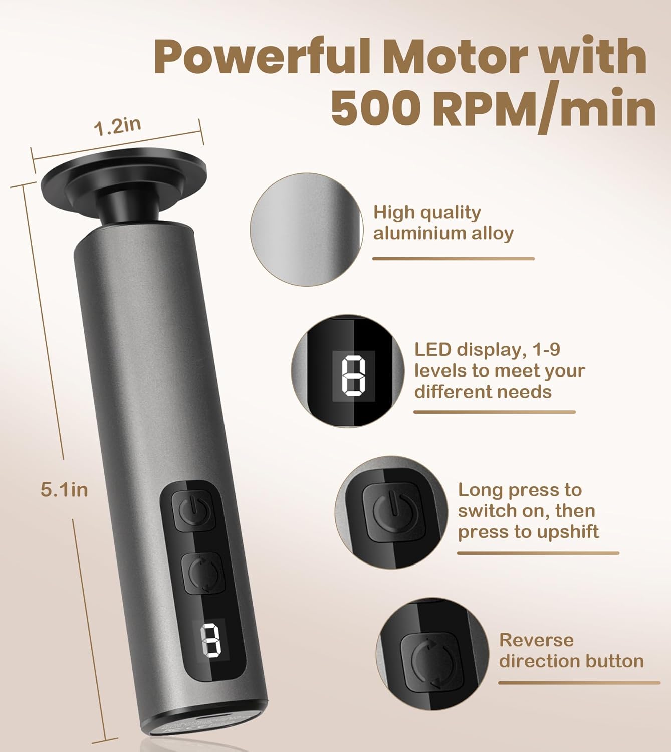 - 9 Adjustable Speed & Comfortable Motor:At only 5.1 inches, smaller than a cell phone screen, this electric callus remover is very portable. Our electric foot callus remover is adjustable to 9 different speeds(0-500 RPM) .Safely and effectively removes stubborn calluses, dead skin and dry cracked heels quickly. Reverse direction button make operation more convenient.