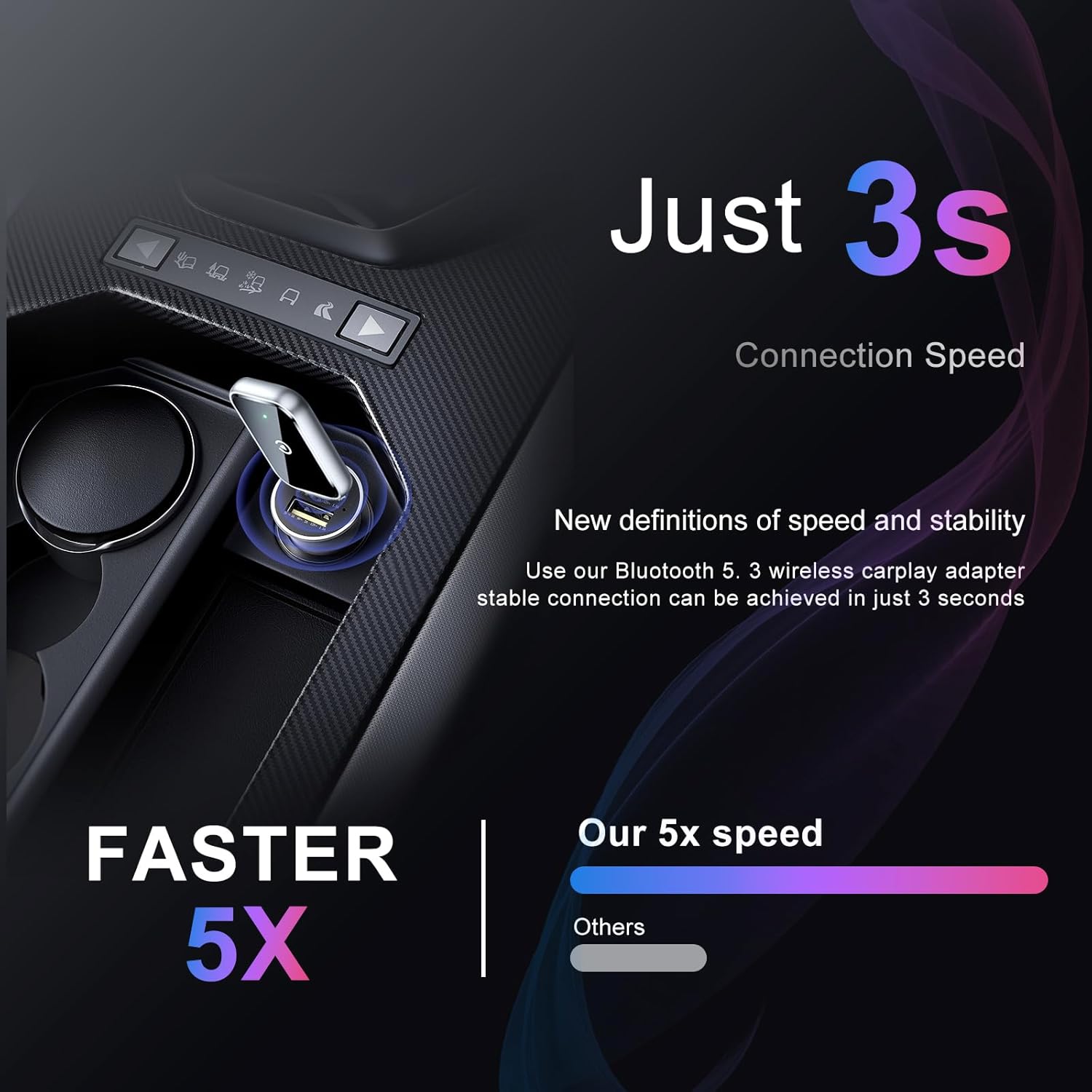 - Ultra-Fast Wireless Connection: Our wireless apple Carplay adapter equipped with the latest 5.8 GHz WiFi, Bluetooth 5.3, and a next-gen chip. Complete the first connection in 10s and auto-connect in 3s with zero daily usage delay. Experience transmission speeds 3 times faster than other adapters. Navigate, play music, take calls, and handle messages easily through Siri, touchscreen, buttons, or knobs, making focused driving truly achievable.