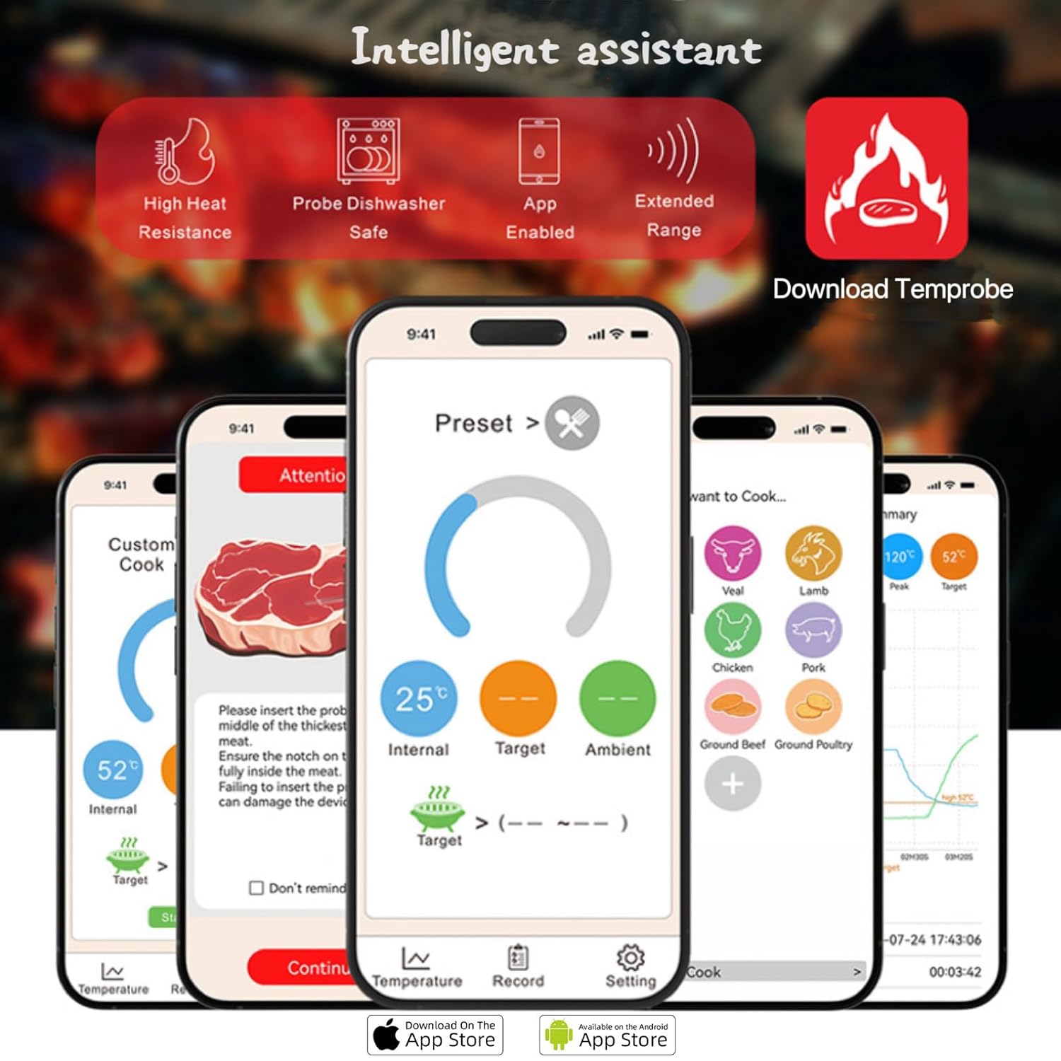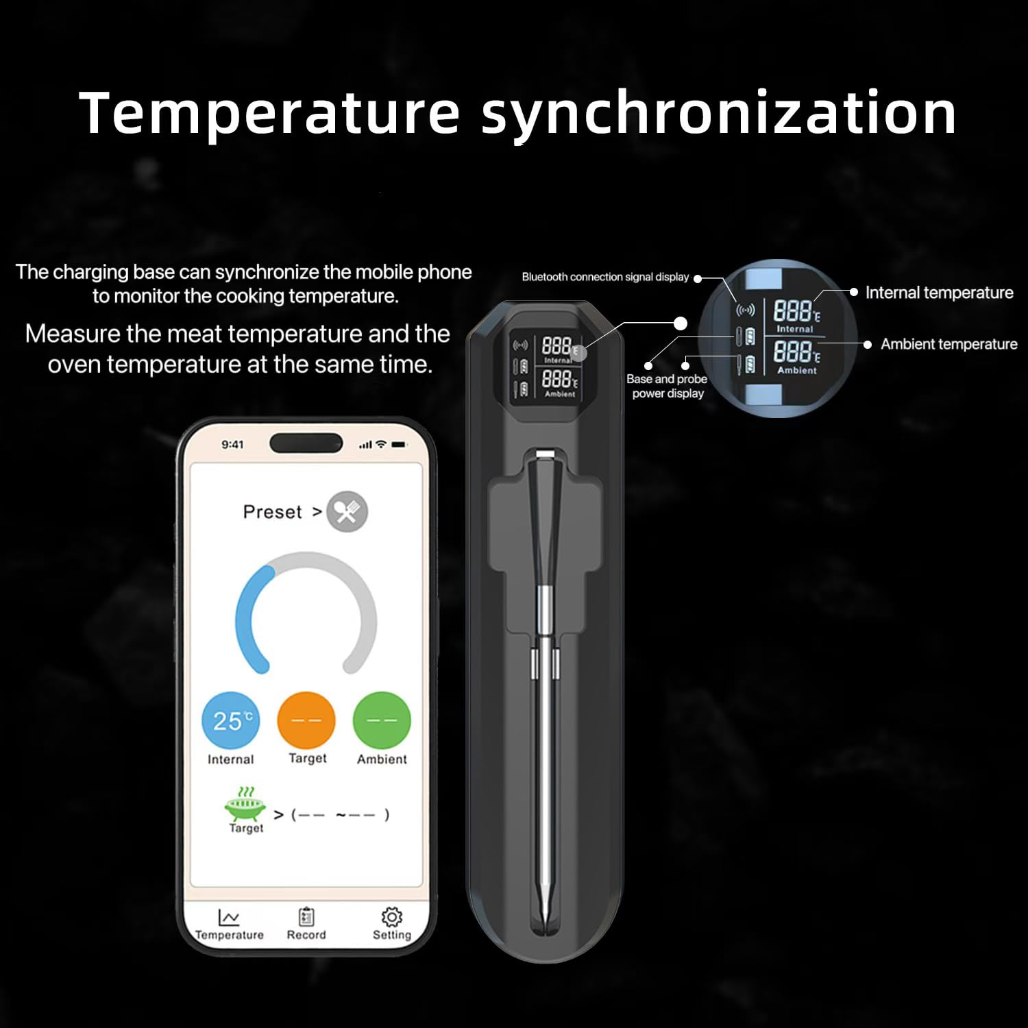 - 【Smart Bluetooth 5.3 Technology】Our wireless Bluetooth meat thermometer utilizes Bluetooth 5.3 technology, offering an incredible 820-foot long-range Bluetooth transmission (in open environments). Monitor food temperatures from anywhere—whether grilling outdoors or cooking indoors—no need to stand by the grill anymore!