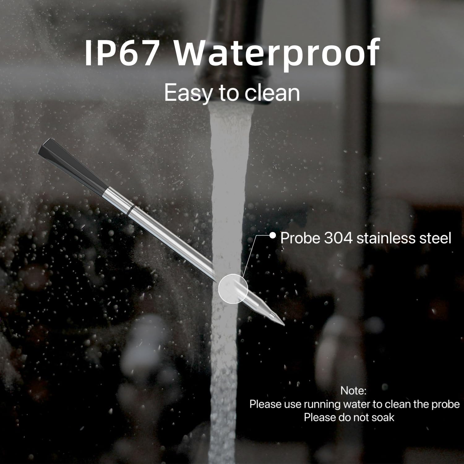 - 【Durable & Easy to Clean】The probe of the wireless meat thermometer is made of food-grade stainless steel and has an IP67 waterproof rating. The housing is made of flame-retardant, high-temperature-resistant, and drop-resistant ABS mirror material. After use, it can be easily wiped under tap water. For deep cleaning, it is also dishwasher-safe, allowing you to remove food residues effortlessly.